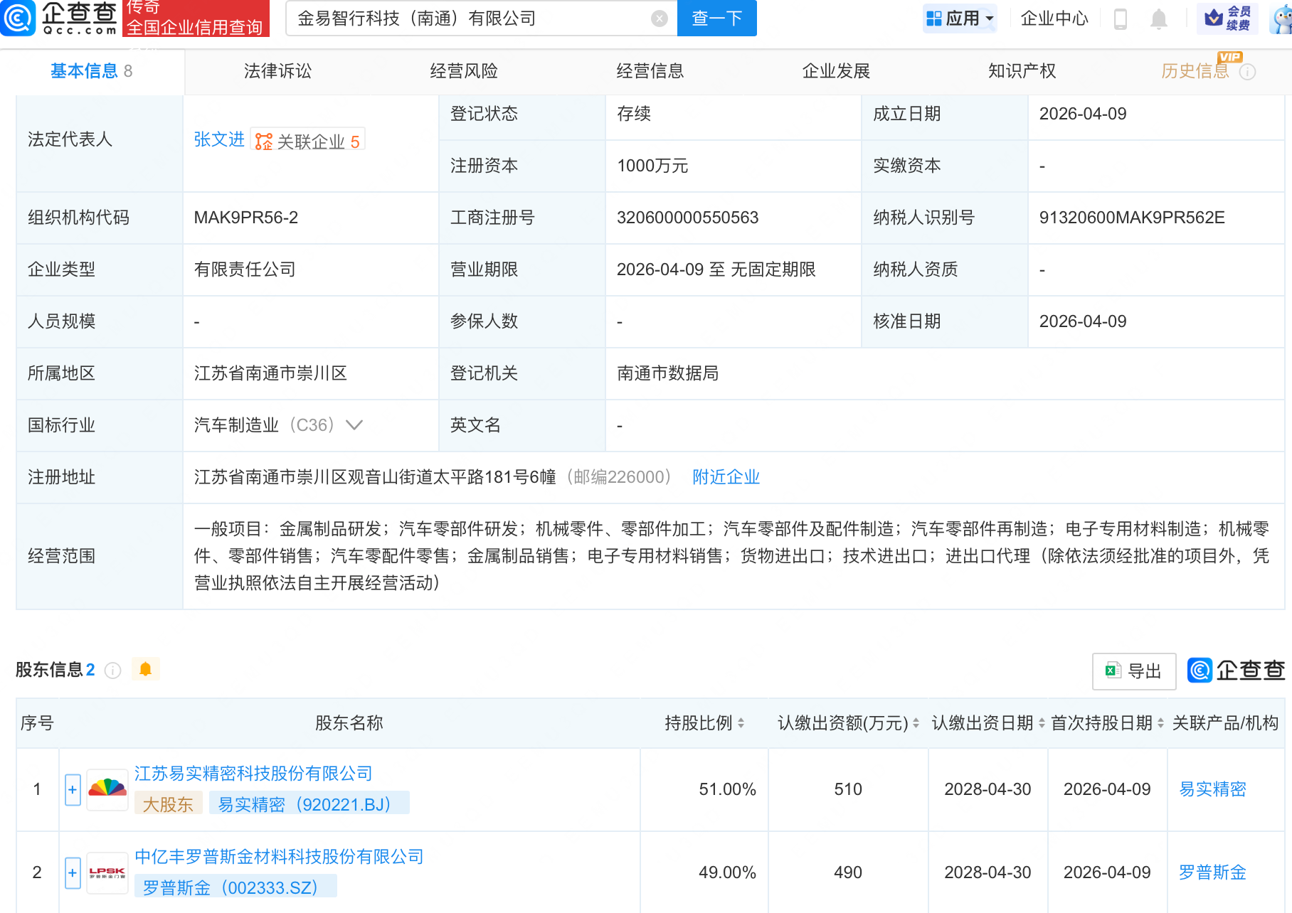 企查查APP显示,近日,金易智行科技(南通)有限公司成立,注册资本1000万元,经营范围包含:汽车零部件研发;机械零件、零部件加工;汽车零部件及配件制造;汽车零部件再制造等。企查查股权穿透显示,该公司由易实精密(920221.BJ)、罗普斯金(002333.SZ)共同持股。