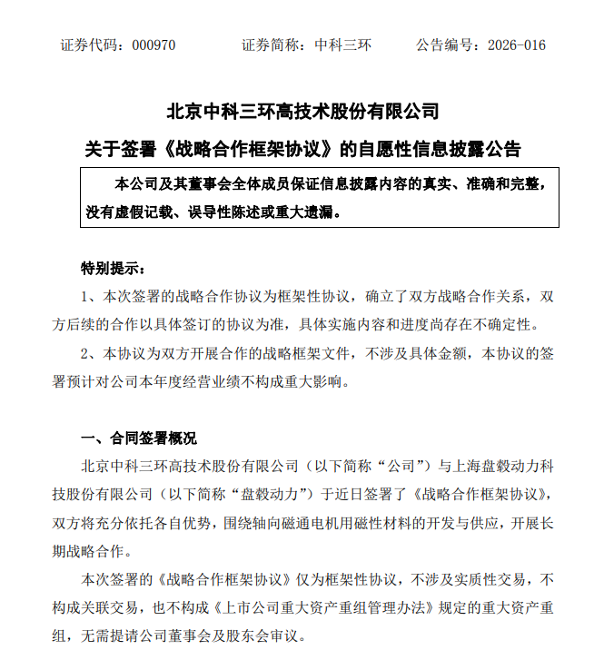 4月9日,中科三环(000970.SZ)公告称,公司与上海盘毂动力科技股份有限公司于近日签署《战略合作框架协议》。双方将围绕轴向磁通电机用磁性材料的开发与供应开展长期战略合作,包括共建联合研发中心,研制超高端磁性材料,建立为期五年的战略采购供应关系,并基于研发成果择机设立合资公司,实现(超)高端磁材专业化生产。此外,双方还将联合承担国家级科研与产业化项目,探索产业链协同与市场拓展。