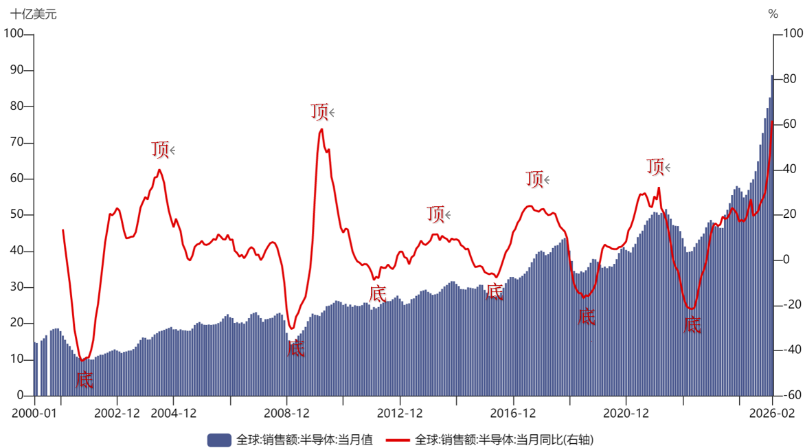根据SIA,2026年2月份全球半导体销售额约为888亿美元,同比增长62%,连续28个月实现同比增长。
