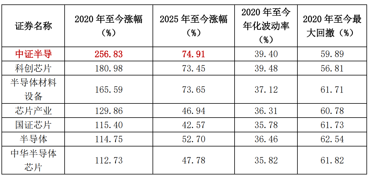 从市场主流7只半导体主题指数表现来看,中证半导体产业指数(简称:中证半导)2020年、2025年至今表现最好,区间累计涨幅分别高达256.83%、74.91%,呈现更高反弹锐度。
