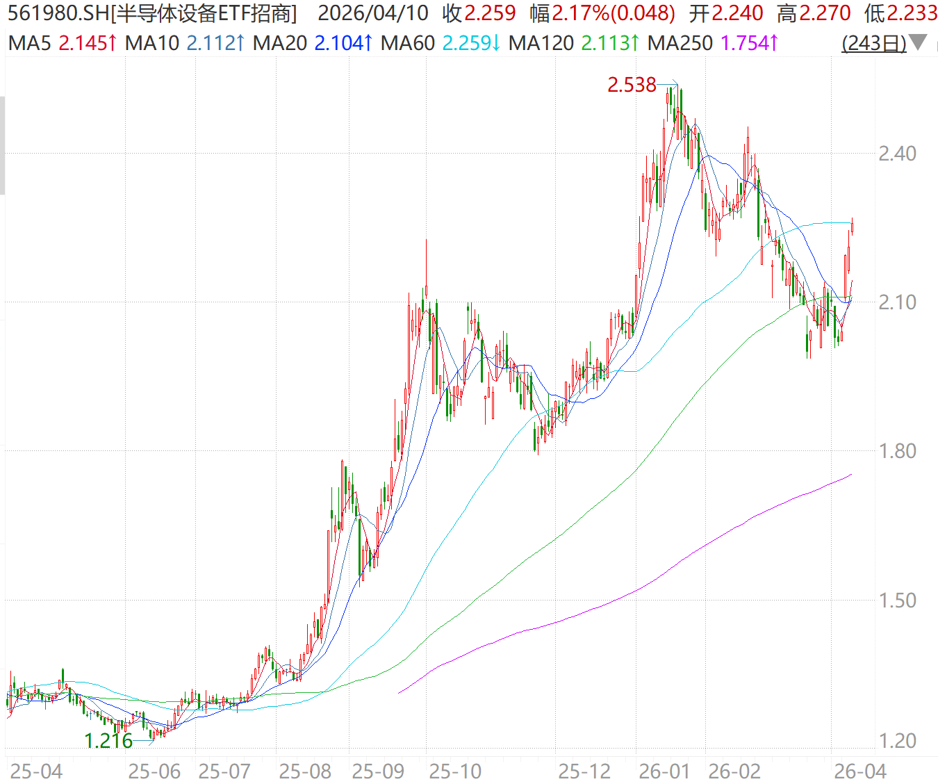 近期,在存储涨价潮、国产化加速、AI算力爆发等多重催化下,国产半导体设备持续走强。4月10日,半导体设备ETF招商(561980)再度高开高走,截至发稿上涨2.17%,日K冲击4连阳。