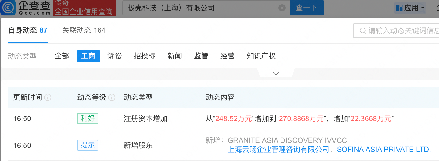 企查查APP显示,近日,极壳科技(上海)有限公司发生工商变更,新增蚂蚁集团旗下上海云玚企业管理咨询有限公司等为股东,同时注册资本增至270.89万元。