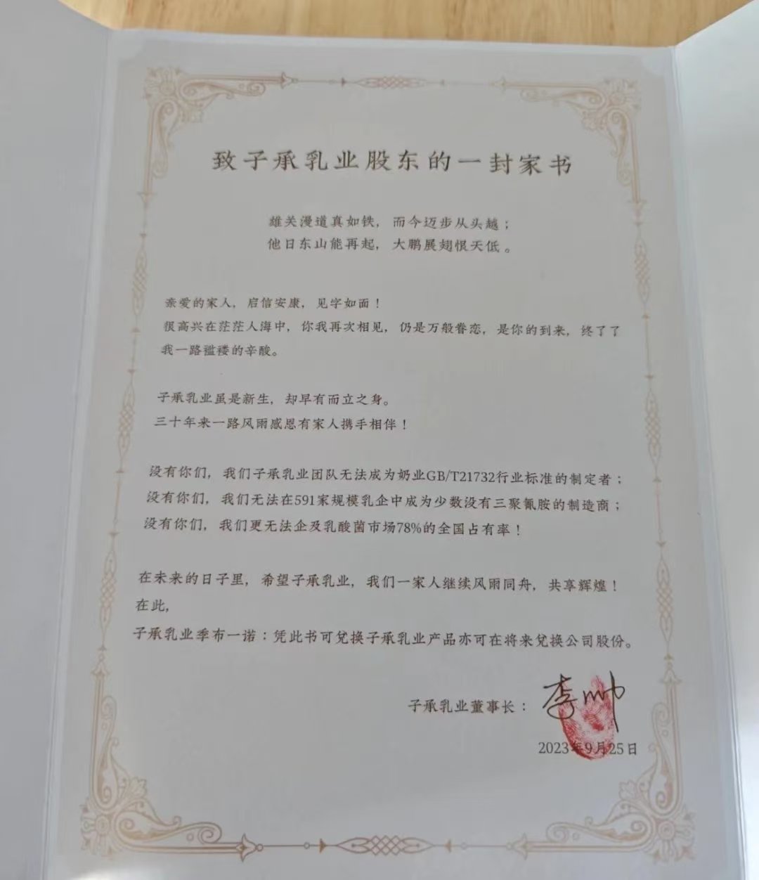 有消费者告诉财闻,就是听过李氏父子的故事才购买其产品支持。2023年,子承乳业还为购买其产品的消费者发放“家书”,这封家书感谢各位消费者“股东”的支持,并承诺,凭此书可兑换子承乳业产品,亦可在将来兑换公司股份。
