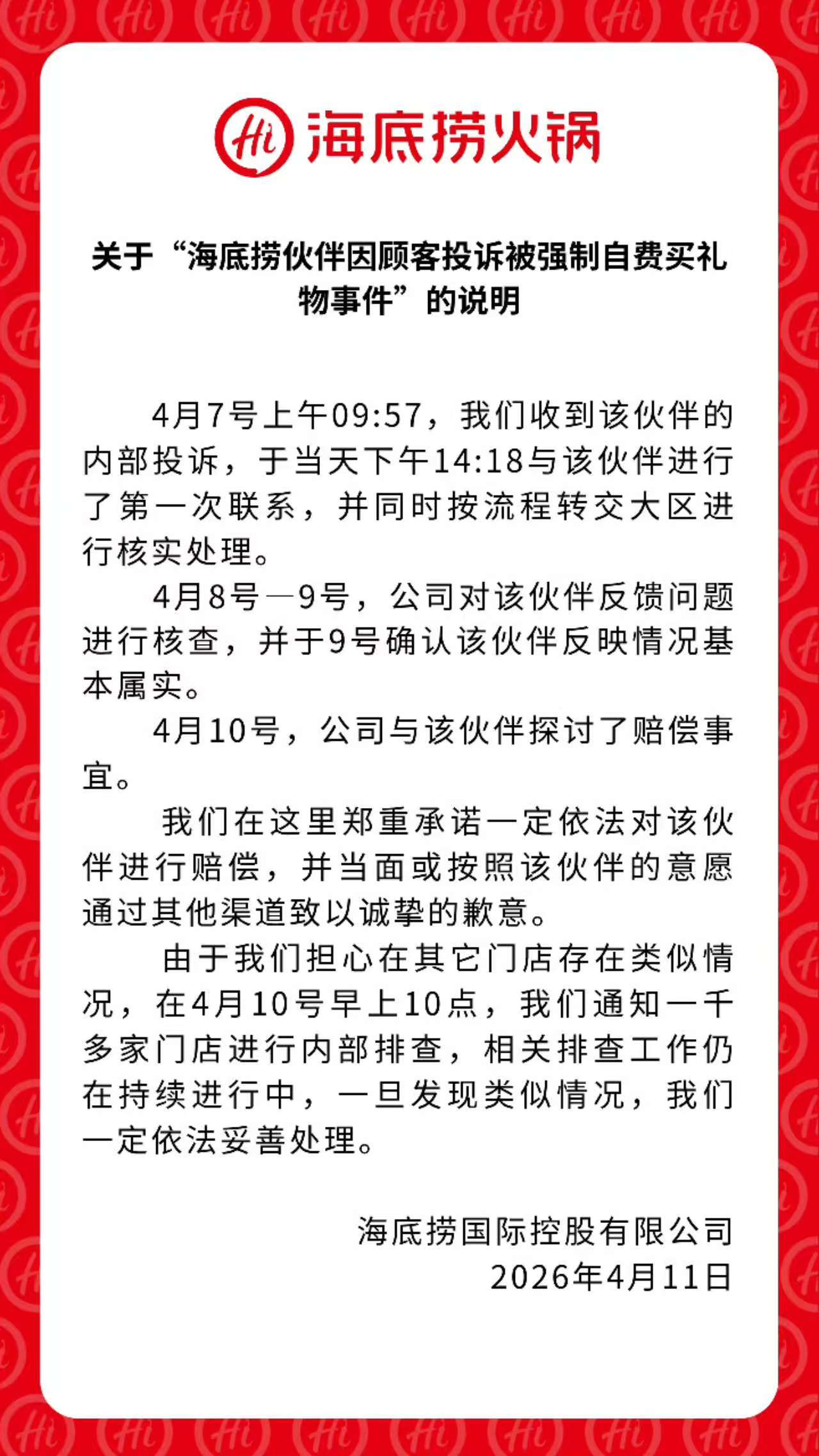 4月11日晚,海底捞(06862.HK)官方微博“海底捞火锅”发布关于“海底捞伙伴因顾客投诉被强制自费买礼物事件”的说明。已确认投诉伙伴反映情况基本属实,并与该伙伴探讨了赔偿事宜。