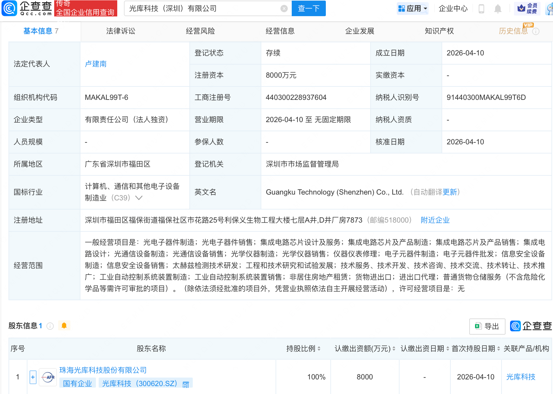 企查查APP显示,近日,光库科技(深圳)有限公司成立,注册资本8000万元,经营范围包含:集成电路芯片设计及服务;集成电路芯片及产品制造;集成电路芯片及产品销售;集成电路设计等。企查查股权穿透显示,该公司由光库科技(300620.SZ)全资持股。