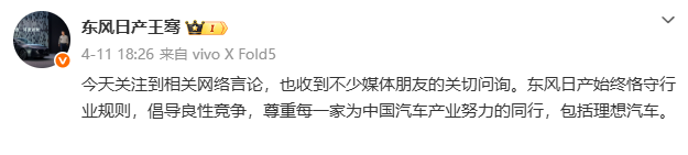 东风日产新能源品牌总经理王骞回应称:“恪守行业规则,倡导良性竞争,尊重每一家同行,包括理想汽车。”