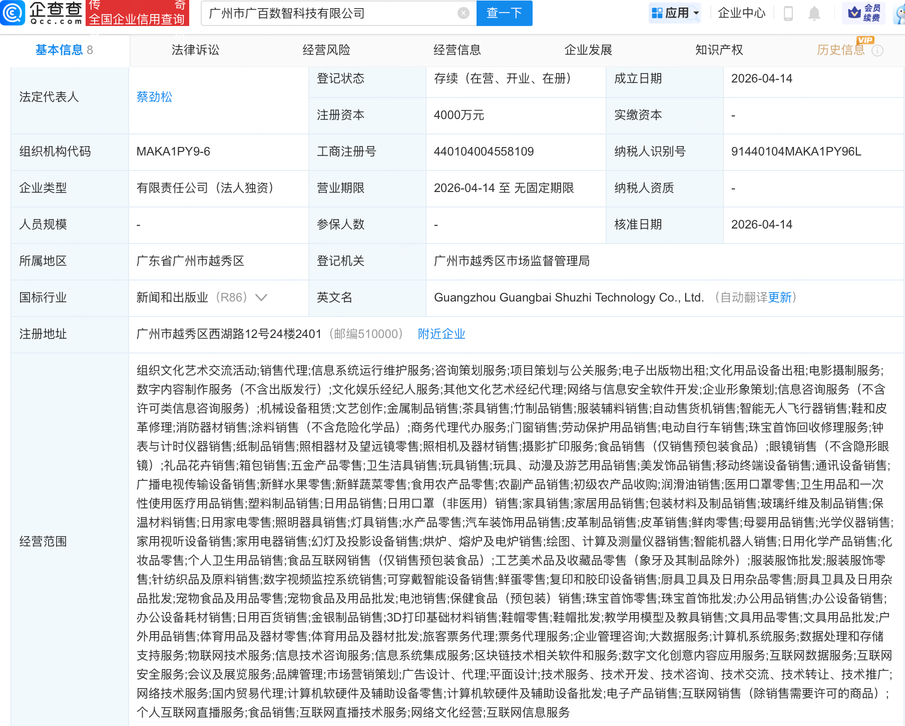 企查查APP显示,近日,广州市广百数智科技有限公司成立,注册资本4000万元,经营范围包含:竹制品销售;服装辅料销售;自动售货机销售;智能无人飞行器销售等。企查查股权穿透显示,该公司由广百股份(002187.SZ)全资持股。