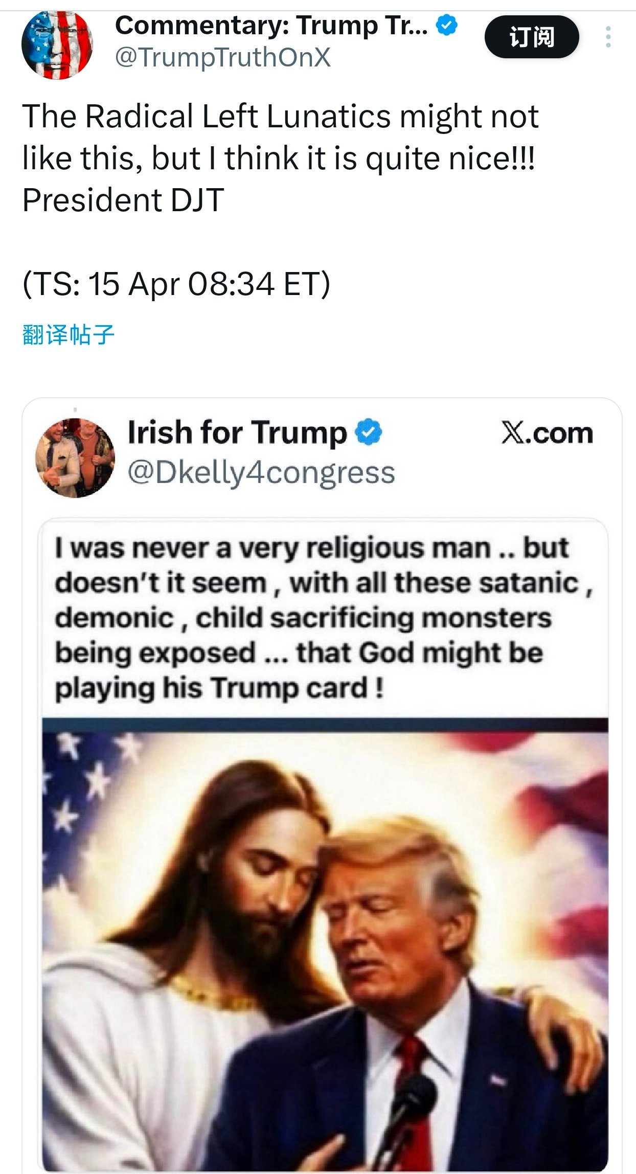 4月16日,据路透消息,美国总统特朗普周三发布了一张耶稣拥抱自己的照片,其政府与教皇之间的口水战看起来丝毫没有缓和的迹象。画面中,特朗普闭着眼睛,与同样闭目姿态的耶稣额头相贴。特朗普站在麦克风后,身后是一面美国国旗。原始帖文的配文中写道:“上帝或许正在打出他的‘特朗普牌’!”