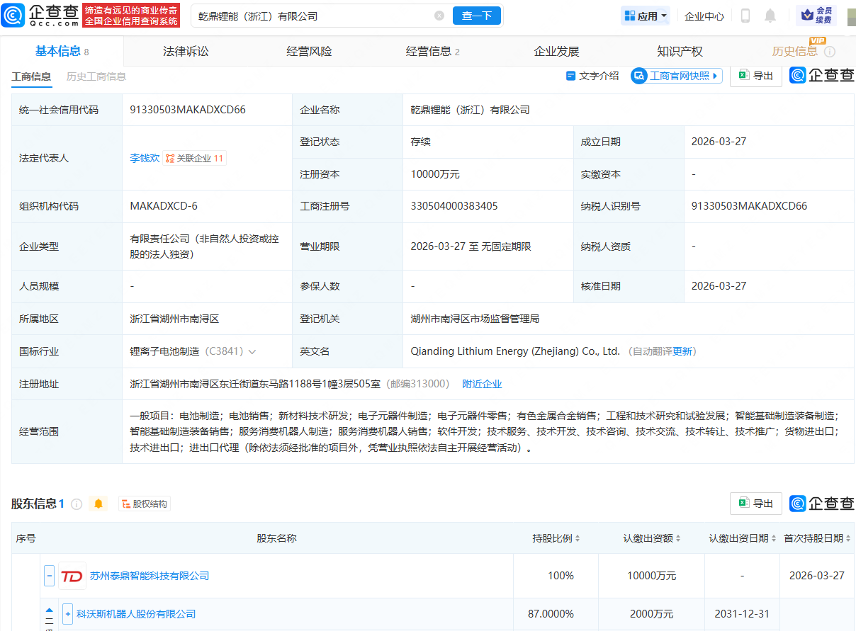 企查查APP显示,近日,乾鼎锂能(浙江)有限公司成立,法定代表人为李钱欢,注册资本为1亿元,经营范围包含:电池制造;电池销售;新材料技术研发;电子元器件制造;电子元器件零售;服务消费机器人制造等。企查查股权穿透显示,该公司由科沃斯(603486.SH)控股的苏州泰鼎智能科技有限公司全资持股。
