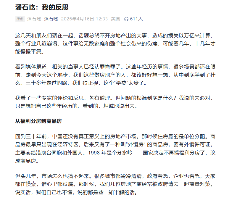 4月16日,SOHO中国有限公司董事长兼联合创始人潘石屹在个人公众号发布“我的反思”一文,内容中直面当前房地产行业几近崩塌、损失以万亿计的现状,并且结合自身三十余年行业亲历,剖析行业危机根源,提出复苏关键在于重拾诚信、保障购房人权益。