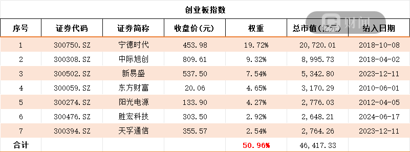 创业板“七姐妹”总权重:50.96%(占创业板指数超半壁江山)。