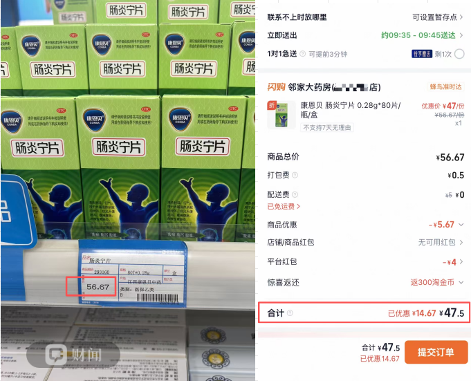 当你肠胃不舒服,随机走进一家连锁药房想买一盒肠炎宁,你会发现货架上一盒品牌肠炎宁的价格为56.67元。但如果你不想出门,而是打开药品外卖平台,你可能发现同样一款药品到手价仅47.5元,有9块多的差价。