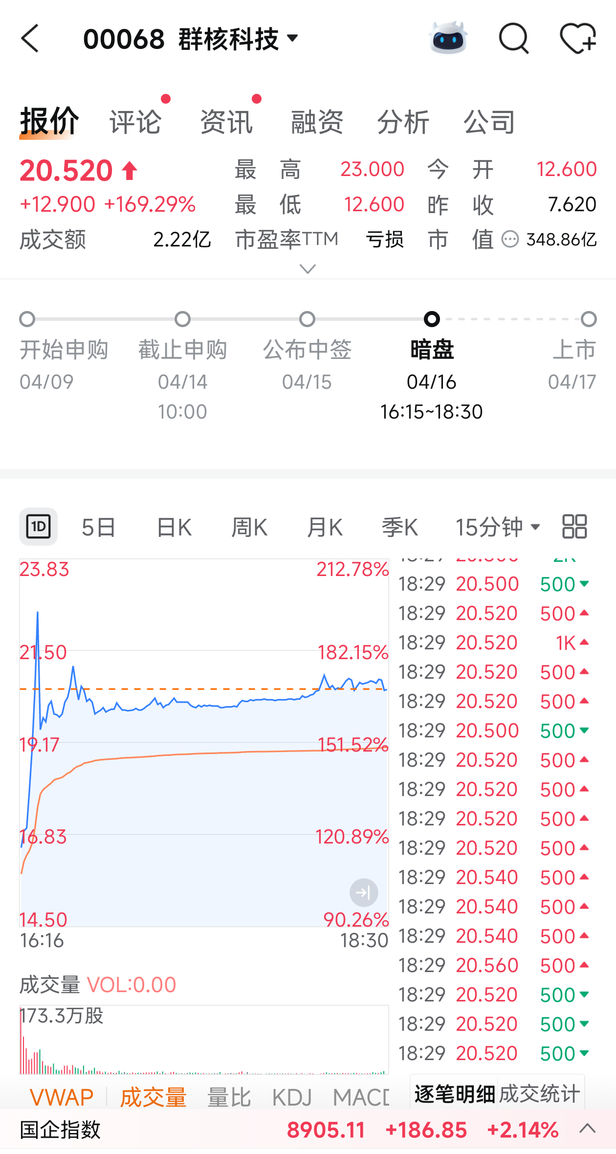 4月16日,“杭州六小龙”之一群核科技(00068.HK)开启暗盘交易,行情软件显示,盘中股价一度冲高至23港元/股,收于20.52港元/股,涨幅为169.29%,暗盘成交金额2.22亿港元。
