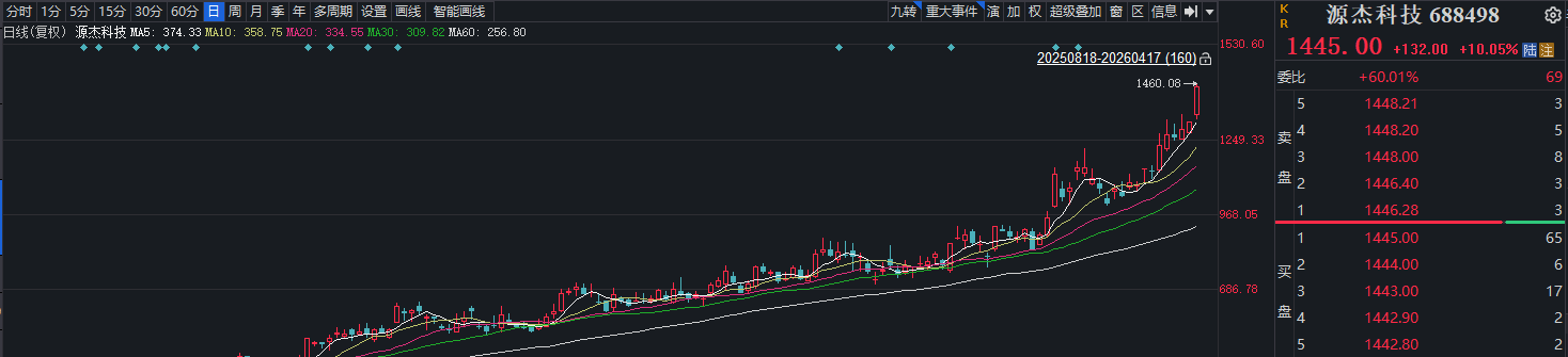 4月17日早盘,源杰科技(688498.SH)股价迅速拉升突破1400元/股,一举超越贵州茅台,问鼎A股第一高价股。午后买盘持续涌入,股价一度达1460.08元/股,刷新历史新高。截至收盘,其总市值已攀升至1242亿元。