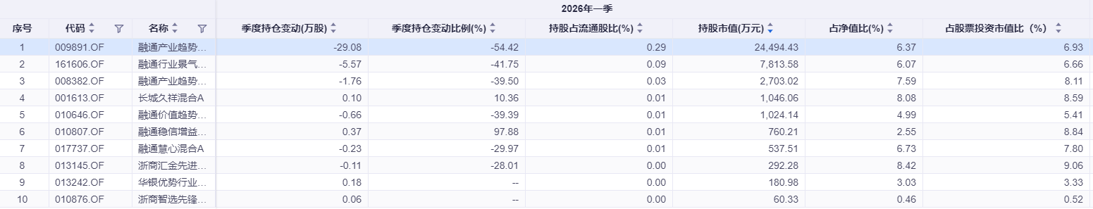 此前大举增持的融通产业趋势臻选,在2026年一季度直接减仓过半,持股减少29.08万股,降幅达54.42%。据不完全统计,融通行业景气、产业趋势、价值趋势等系列基金也已在一季度进行了减持操作。