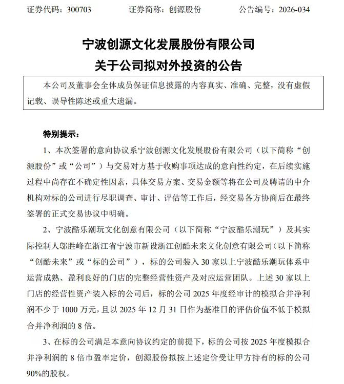 2026年4月16日,创源股份公告称,拟收购宁波酷乐潮玩文化创意有限公司(简称“酷乐潮玩”)旗下新设子公司浙江创酷未来文化创意有限公司(简称“创酷未来”)90%股权,后者将装入酷乐潮玩体系内30家以上成熟门店的经营性资产及团队。