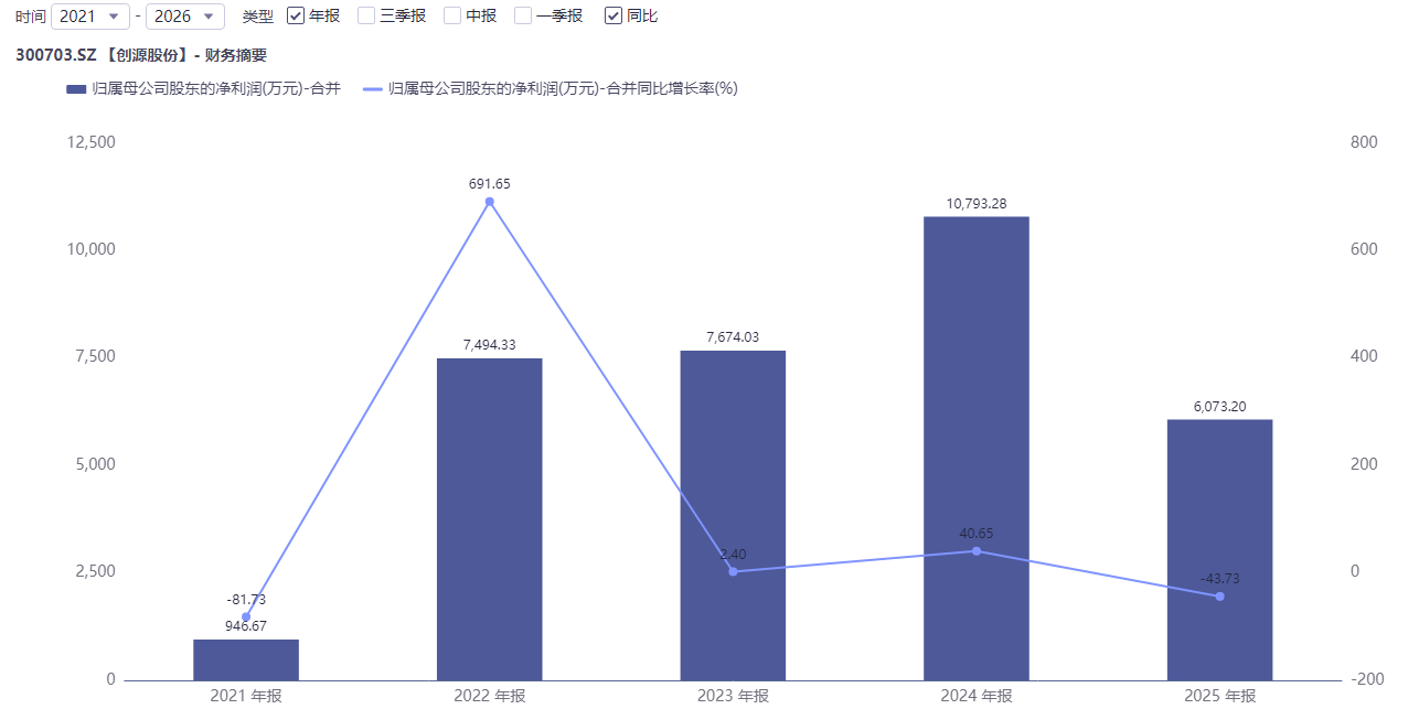 同花顺iFinD显示,2022年—2025年,创源股份业绩表现并不算好,营收规模虽从13.19亿元增至21.44亿元,但归母净利却止步不前,2025年仅盈利6073.20万元,同比下滑43.73%,接近腰斩。