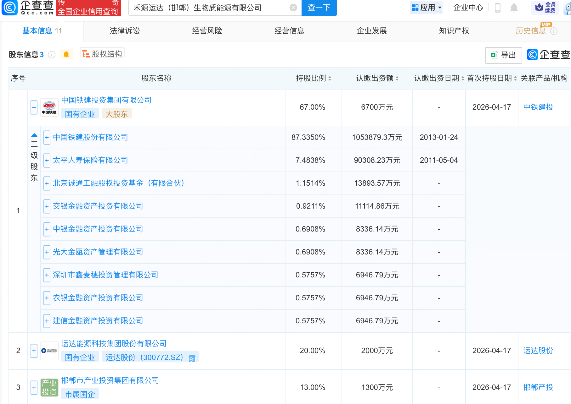 企查查APP显示,近日,禾源运达(邯郸)生物质能源有限公司成立,注册资本1亿元,经营范围包含:生物质成型燃料销售;生物质能技术服务;生物质液体燃料生产工艺研发等。企查查股权穿透显示,该公司由中国铁建(601186.SH)旗下中国铁建投资集团有限公司、运达股份(300772.SZ)等共同持股。