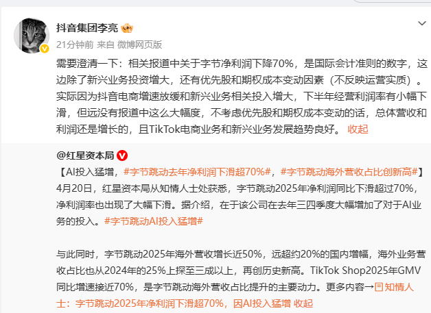 抖音集团副总裁李亮回应字节净利下滑70%:是国际会计准则的数字