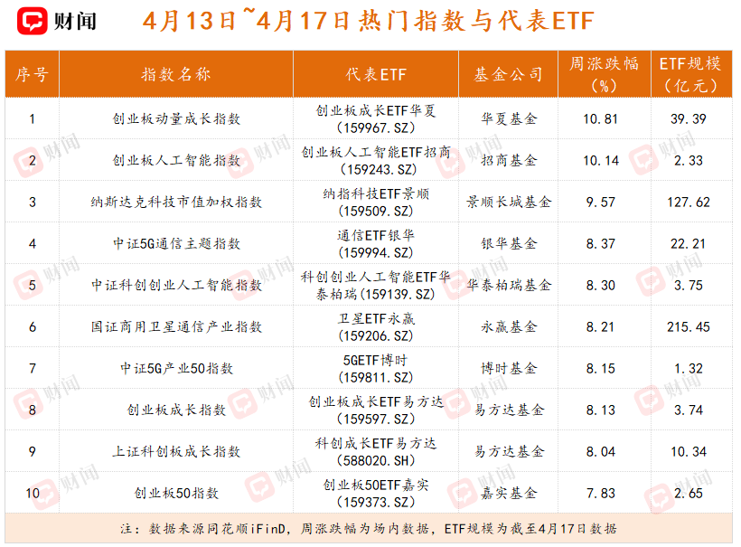 上周(4月13日至4月17日),A股市场延续回暖态势。三大指数集体收涨,其中上证指数上涨1.64%,深证成指上涨4.02%,创业板指更是大涨6.65%,一举创下近十年新高。
