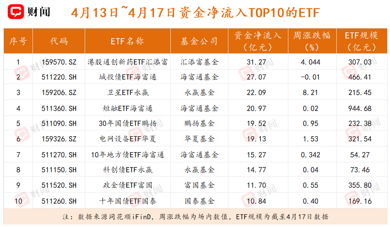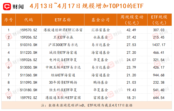 上周,港股通创新药ETF汇添富规模增长42.49亿元,是全市场规模增量最多的产品。截至4月17日,该ETF规模达307.03亿元,创历史新高。