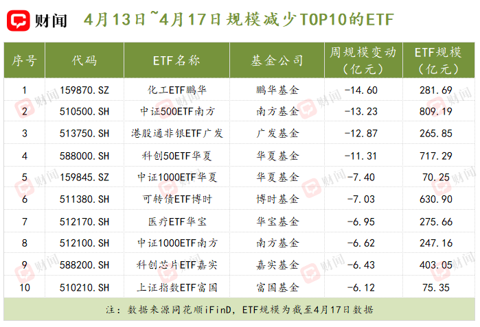 在上周市场上涨的情况下,ETF规模缩水幅度有限。化工ETF鹏华是上周规模缩水最多的产品,缩水金额为14.60亿元。此外,全市场仅有中证500ETF南方、港股通非银ETF广发和科创50ETF华夏等产品规模缩水超10亿元。