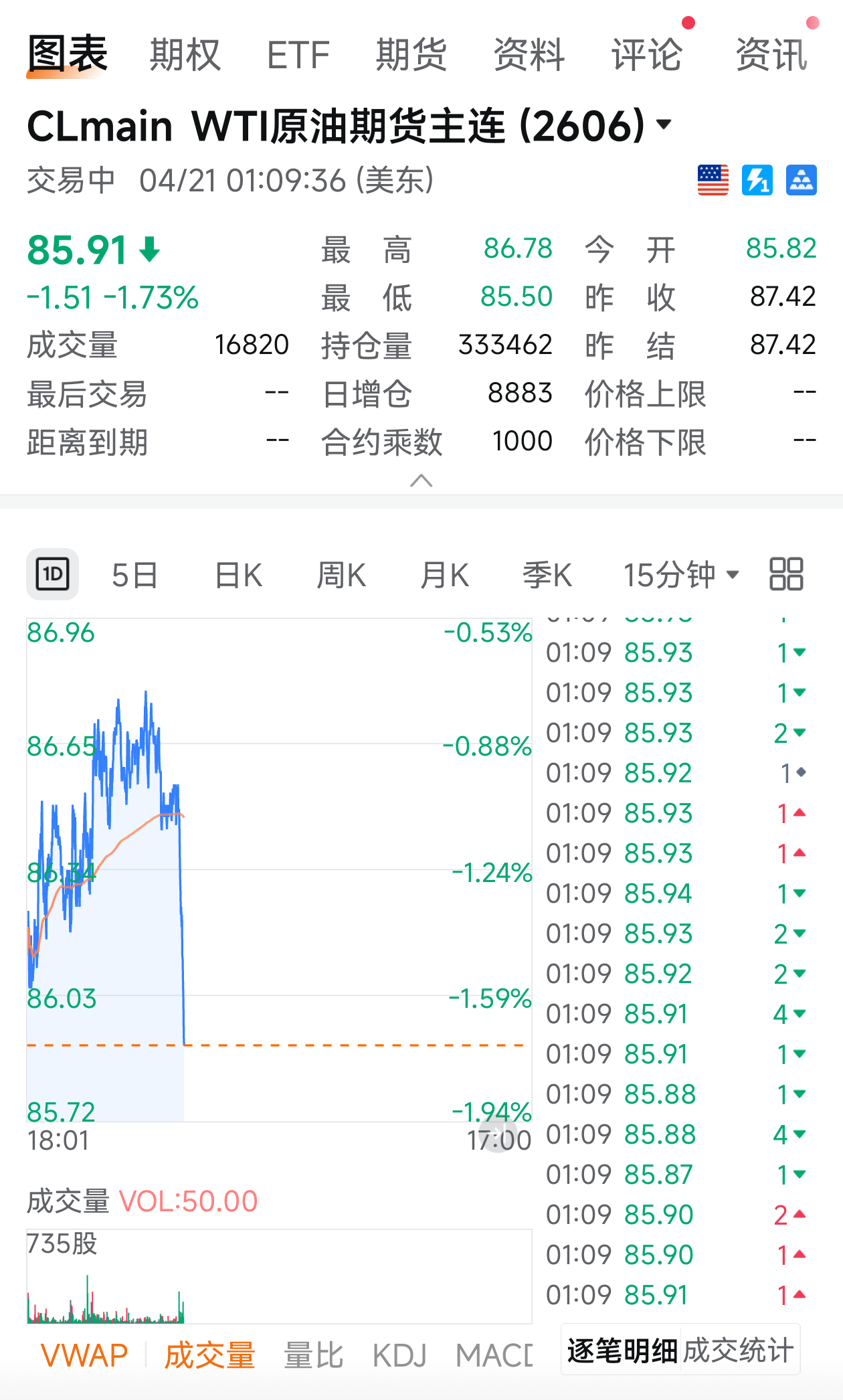 4月21日,截至发稿时,WTI原油失守85.91美元/桶,日内跌1.73%;布伦特原油跌1.23%,报94.31美元/桶。