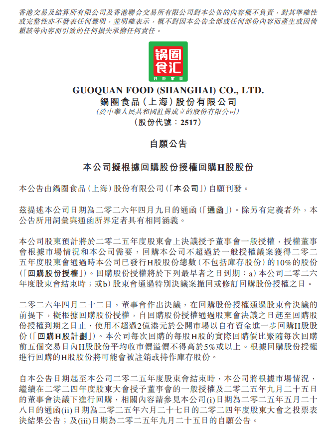 4月22日晚间,锅圈(02517.HK)发布自愿公告,公司董事会于2026年4月22日决议,在获得2025年度股东大会授予的回购股份授权前提下,拟自授权通过之日起至授权到期日止,使用不超过2.00亿港元自有资金于公开市场回购H股股份。回购价格上限为每次回购前五个交易日H股平均收市价溢价不超过5%。回购股份将注销或作为库存股。