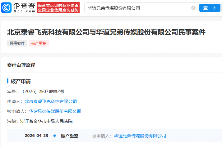 企查查APP显示,近日,华谊兄弟(300027.SZ)新增一则破产审查案件信息,申请人为北京泰睿飞克科技有限公司,经办法院为浙江省金华市中级人民法院。