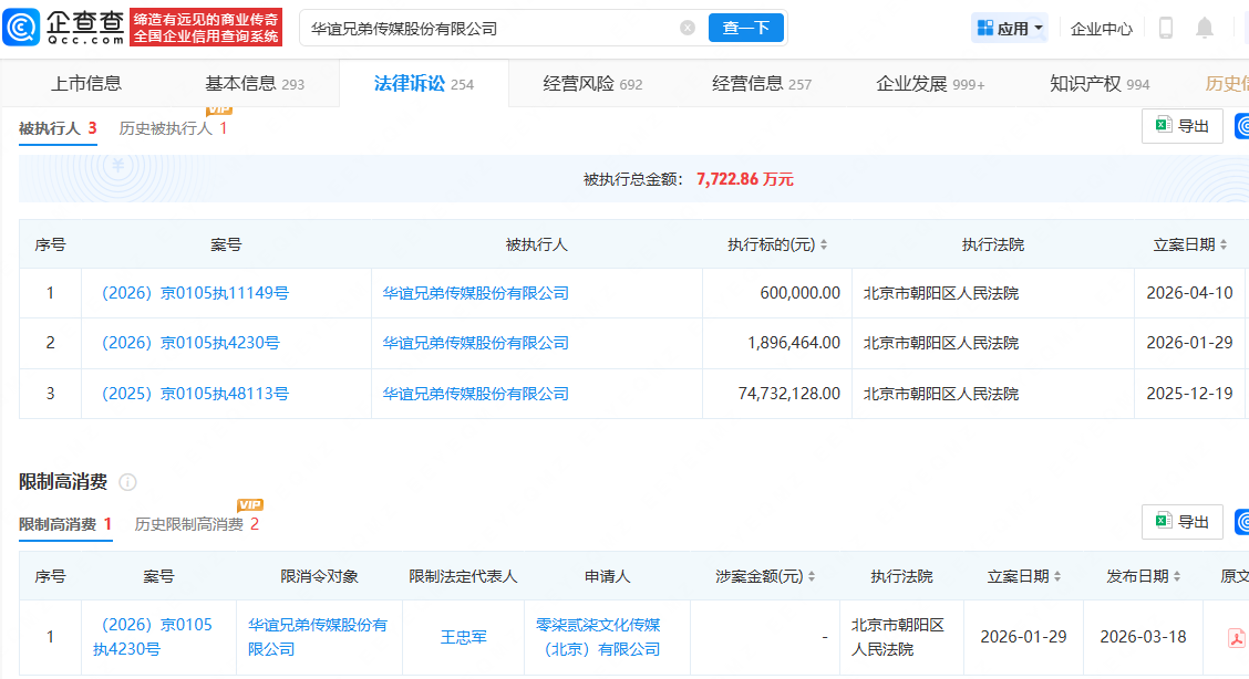 风险信息显示,华谊兄弟已被列为被执行人,并被限制高消费。