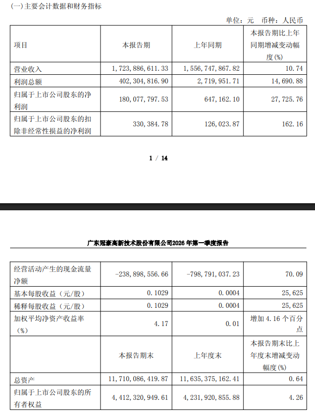 4月23日,冠豪高新(600433.SH)公告称,2026年第一季度实现营业收入17.24亿元,同比增长10.74%;归属于上市公司股东的净利润为1.80亿元,同比增长27725.76%。业绩变动主要系本期新增应收土地使用权被收回补偿款项事项,净利润增加。