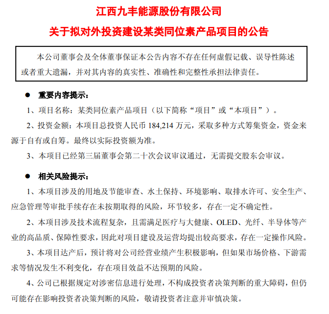 4月23日,九丰能源(605090.SH)公告称,公司控股子公司江西九丰稳同新材料有限公司拟对外投资建设某类同位素产品项目,项目总投资18.42亿元。本项目实施后,公司将进一步培育高壁垒的资源型产品,丰富公司特种气体客户所需的产品结构,并与公司现有其他特种气体产品(氦气、氢气及其他特燃特气等)形成互补、高效协同;同时,公司将在锚定的特燃特气客户领域基础上,进一步服务医疗与大健康、OLED、光纤、半导体等产业领域。