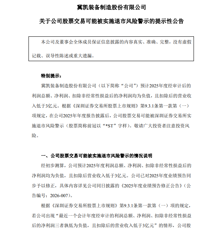 4月23日,冀凯股份(002691.SZ)公告称,公司预计2025年度经审计后的利润总额、净利润、扣除非经常性损益后的净利润均为负值,且扣除后的营业收入低于3亿元。根据《深圳证券交易所股票上市规则》相关规定,在公司2025年年度报告披露后,公司股票交易可能被深圳证券交易所实施退市风险警示(股票简称前冠以“*ST”字样)。