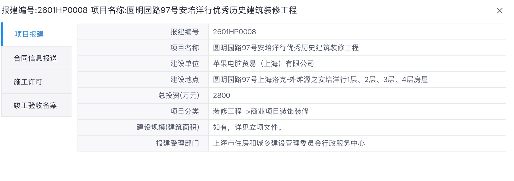 财闻从上海住建委网站获悉,位于上海圆明园路97号上海洛克•外滩源的百年建筑——安培洋行近日更新一项历史建筑装修工程,总投资金额为2800万元,建设单位为苹果电脑贸易(上海)有限公司。从项目报建信息看,项目分类为商业项目装饰装修。目前暂不清楚苹果将此建筑用于何种用途,项目合同信息和施工许可暂未公示。