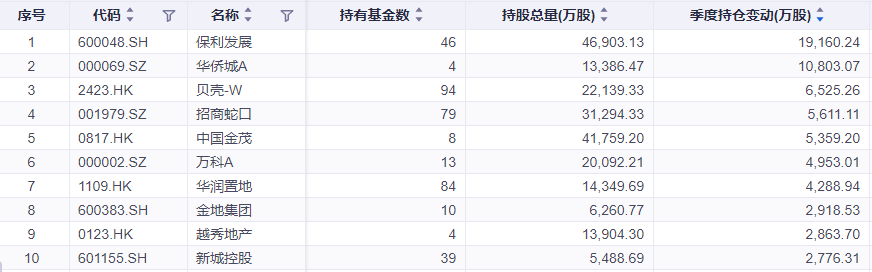 从增持的绝对值来看,保利发展(600048.SH)、华侨城A(000069.SZ)、贝壳-W(02423.HK)、招商蛇口(001979.SZ)、中国金茂(00817.HK)、万科A(000002.SZ)和华润置地(01109.HK)等头部企业成为公募基金的“心头好”。其中,对保利发展和华侨城A的增持数量均超过1亿股。