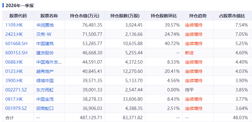2026年一季度,公募基金对地产股的配置迎来了久违的转机。数据显示,该季度公募基金增持地产股6.85亿股,一举扭转了2025年持续低配的局面。