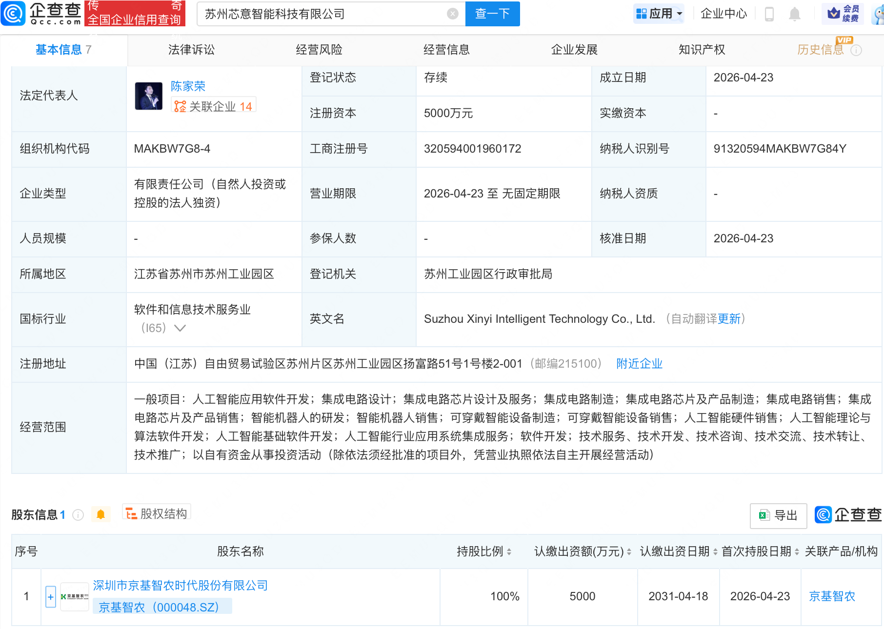 企查查APP显示,近日,苏州芯意智能科技有限公司成立,注册资本5000万元,经营范围包含:人工智能应用软件开发;集成电路设计;集成电路芯片设计及服务;智能机器人的研发等。企查查股权穿透显示,该公司由京基智农(000048.SZ)全资持股。