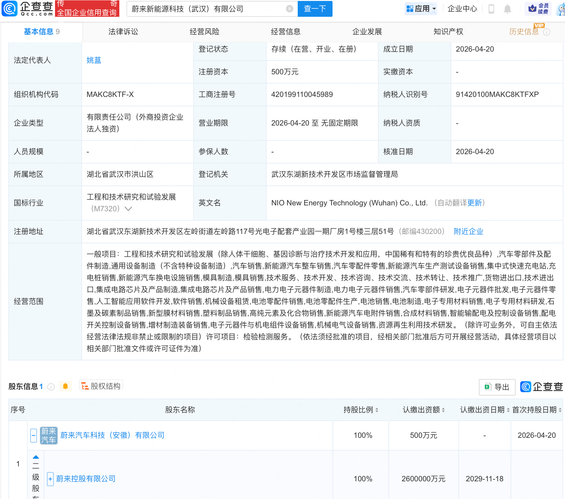蔚来在武汉成立新能源科技公司,含AI业务