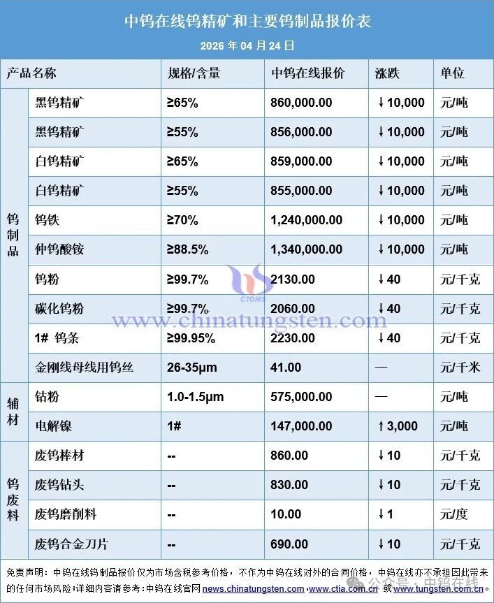 4月24日,中钨在线发布消息,本周钨价整体呈现下行趋势,市场成交清淡,供需博弈胶着。前期持续上涨积累的丰厚的利润,使得供给端出现集中获利了结,部分持货商选择低位出货,卖方阵营出现分化。与此同时,买方“不买跌”情绪浓厚,采购意愿明显收缩,观望心态占据主导,议价权逐步向需求端倾斜。