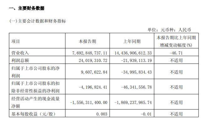2026年第一季度实现营业收入76.93亿元,同比下降46.71%;归属于上市公司股东的净利润为960.76万元,同比扭亏为盈。