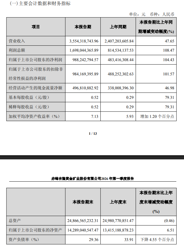 4月24日,赤峰黄金(600988.SH)公告称,2026年第一季度实现营业收入35.54亿元,同比增长47.65%;归属于上市公司股东的净利润为9.88亿元,同比增长104.43%。业绩变动主要系公司持续优化生产组织与运营管理,并充分受益于黄金价格同比较大幅度上涨。