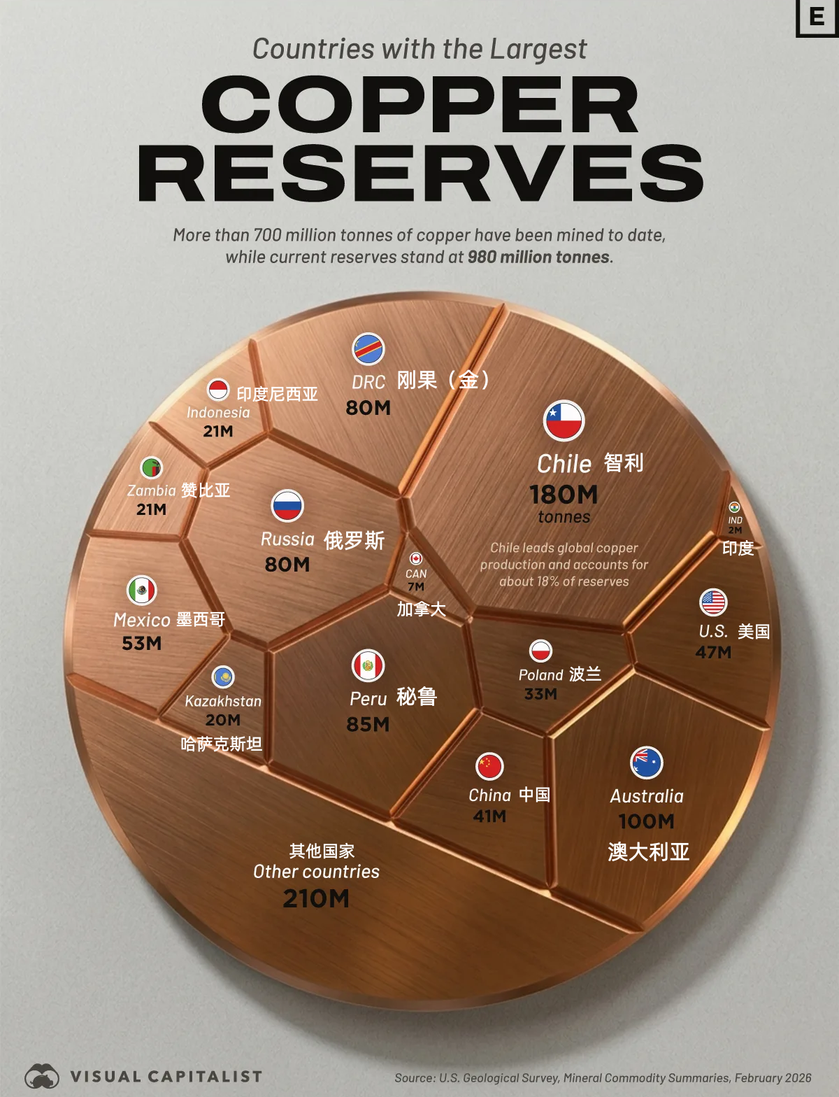 全球铜储量近10亿吨,智利独占鳌头,前五国掌控半壁江山!