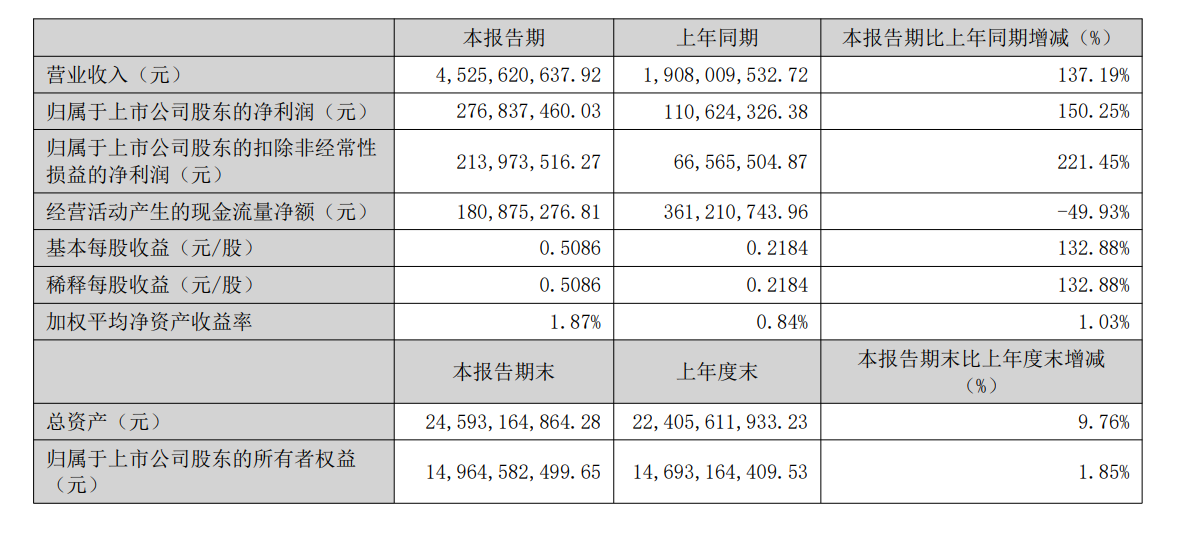 4月24日,当升科技(300073.SZ)公告称,2026年第一季度实现营业收入45.26亿元,同比增长137.19%;归属于上市公司股东的净利润为2.77亿元,同比增长150.25%。业绩变动主要系锂电正极材料销量增长,叠加产品售价随着原材料市场行情大幅增长,导致经营业绩增长。