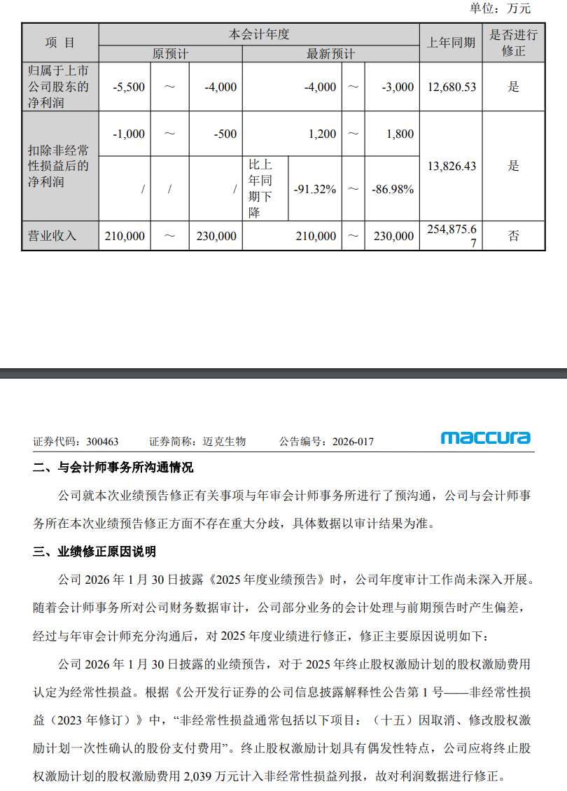 终止股权激励计划费用调整,迈克生物预计2025年净利润同比下降86.98%至91.32%