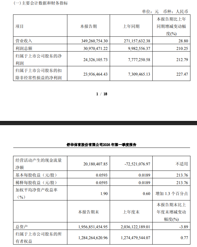 4月24日,舒华体育(605299.SH)公告称,2026年第一季度实现营业收入3.49亿元,同比增长28.80%;归属于上市公司股东的净利润为2432.61万元,同比增长212.79%。业绩变动主要系受本期营业收入同比去年同期增长28.80%影响,本期毛利额同比去年同期增加2,143.02万元;同时本期各类费用及减值损失等合计同比去年同期未有明显变化,故本期利润总额同比去年同期增长210.25%,增加2,098.79万元。受本期利润总额增长影响,归属于上市公司股东的净利润随之增长。