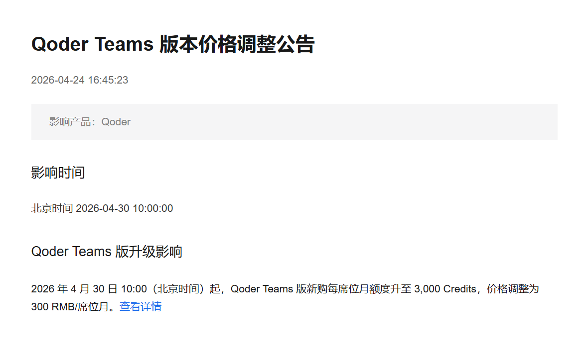 4月24日,阿里云发布公告,2026年4月30日10:00(北京时间)起,Qoder Teams版新购每席位月额度升至3,000Credits,价格调整为300RMB/席位月。