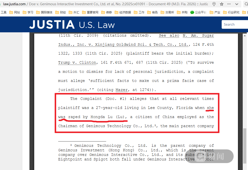 根据上述文件表述,一名居住在佛罗里达的27岁女性,指控遭到名为Hongda Lu的中国公民强奸。并指出,Hongda Lu为Genimous Technology Co., Ltd.董事长。