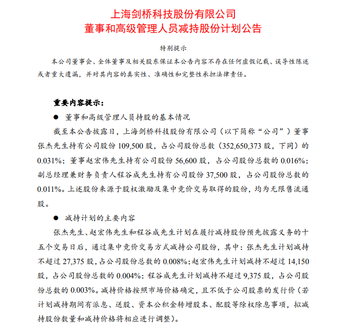 4月24日,剑桥科技(603083.SH)公告称,董事张杰、赵宏伟及副总经理程谷成因个人资金需求,计划于2026年5月21日至2026年8月20日期间,通过集中竞价交易方式减持公司股份。其中,张杰拟减持不超过2.74万股(占总股本0.008%),赵宏伟拟减持不超过1.42万股(占总股本0.004%),程谷成拟减持不超过0.94万股(占总股本0.003%)。