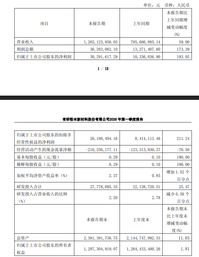 4月24日,有研粉材(688456.SH)公告称,2026年第一季度实现营业收入12.65亿元,同比增长59.00%;归属于上市公司股东的净利润为3029.16万元,同比增长193.05%。业绩变动主要系受销量增长以及原材料价格上涨影响,营业收入同比增长;本期销量同比增长,经营性利润增加。