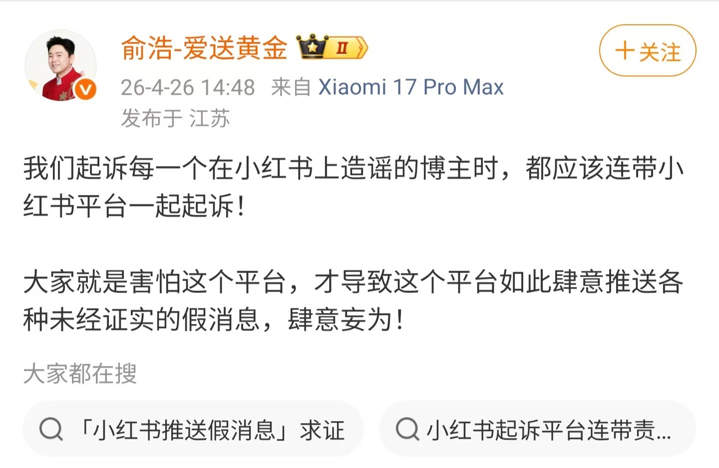 在发布上文后,俞浩随即又发文称,“我们起诉每一个在小红书上造谣的博主时,都应该连带小红书平台一起起诉!大家就是害怕这个平台,才导致这个平台如此肆意推送各种未经证实的假消息,肆意妄为!”